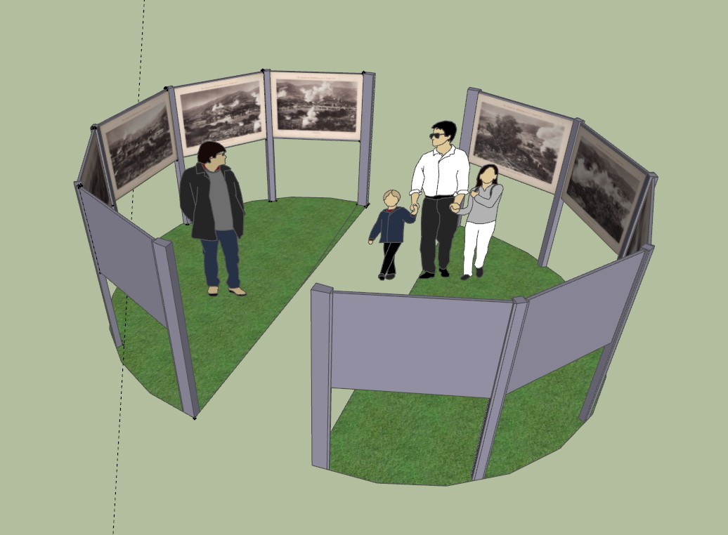J'ai choisi de créer cette première structure avec des panneaux gris anthracite de dimensions 200x120cm car la forme et la couleur de ces panneaux d'exposition rappelle les pierres tombales qui ont dû être nombreuses après cette bataille.