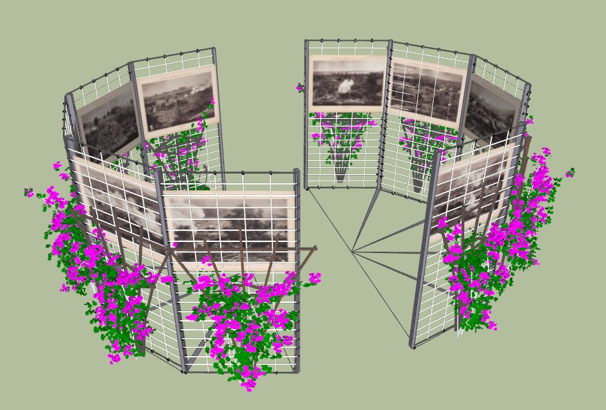 J'ai ensuite décidé de créer cette deuxième structure pour, contrairement à la première, déposer des pots de fleurs en dessous des tableaux afin de créer un contraste entre la vie (les plantes) et la mort (le combat). Les poteaux ont une épaisseur de 5cm et mesurent 200cm de haut. Les panneaux ont pour dimensions 120x85cm.