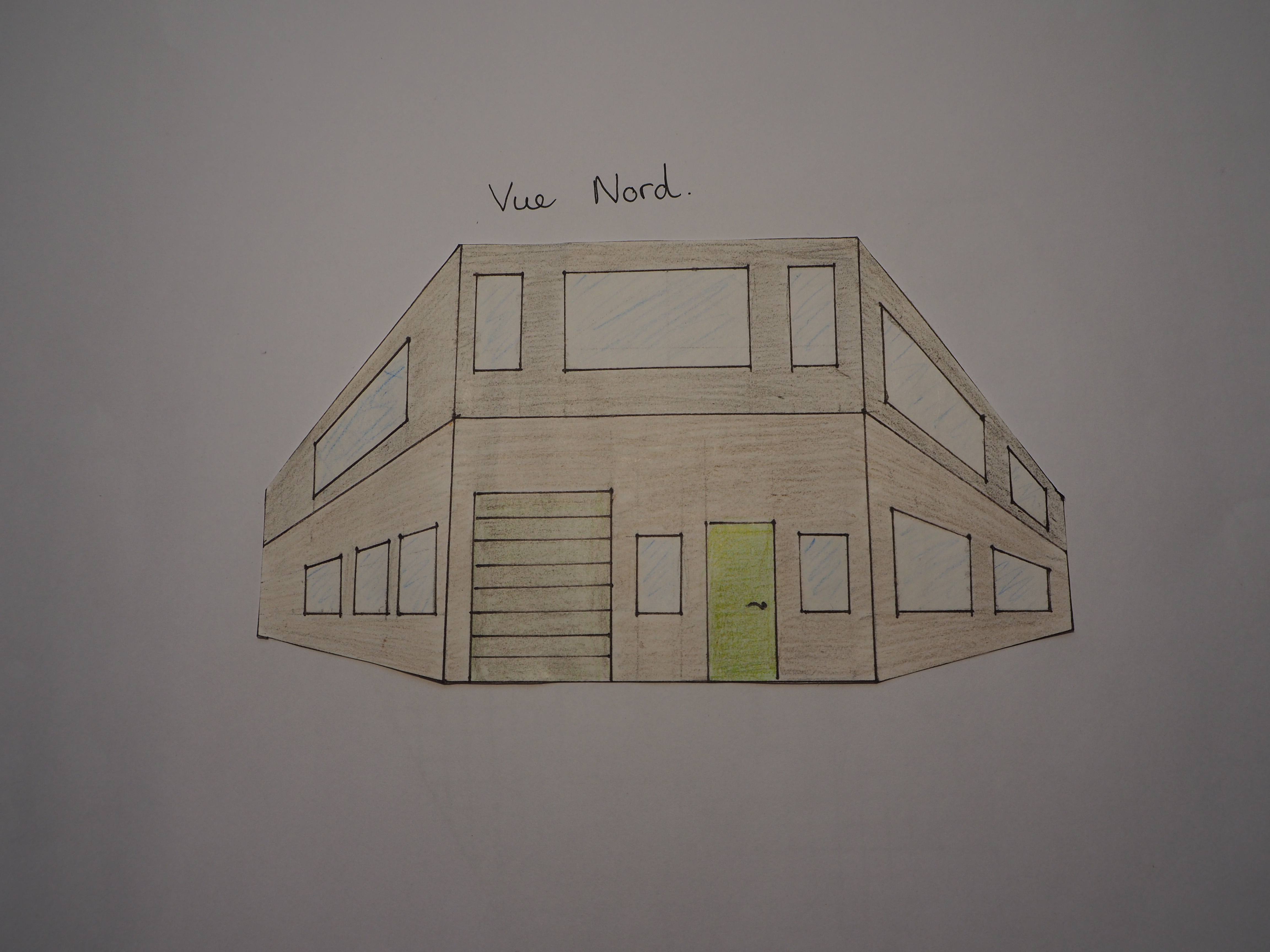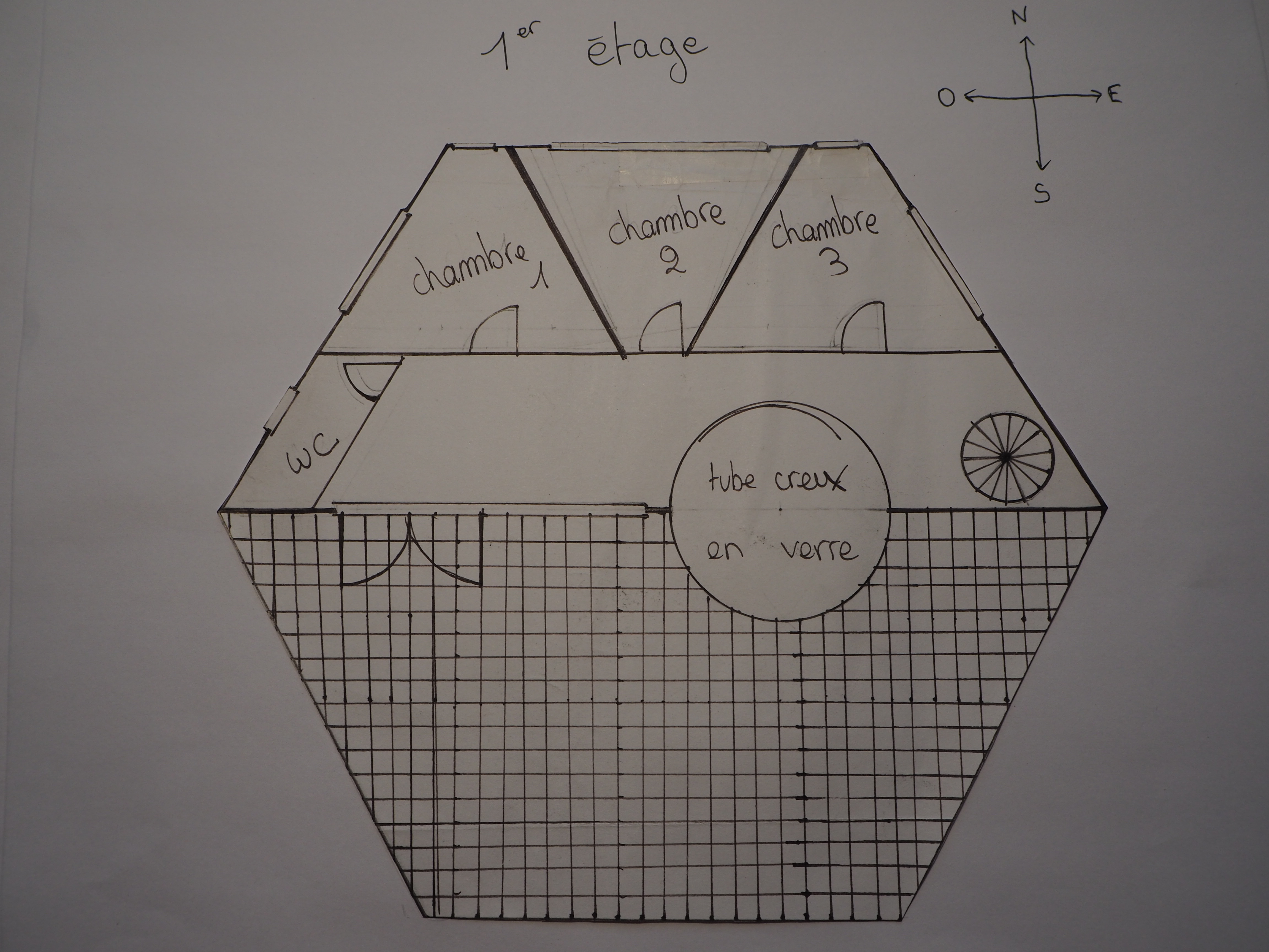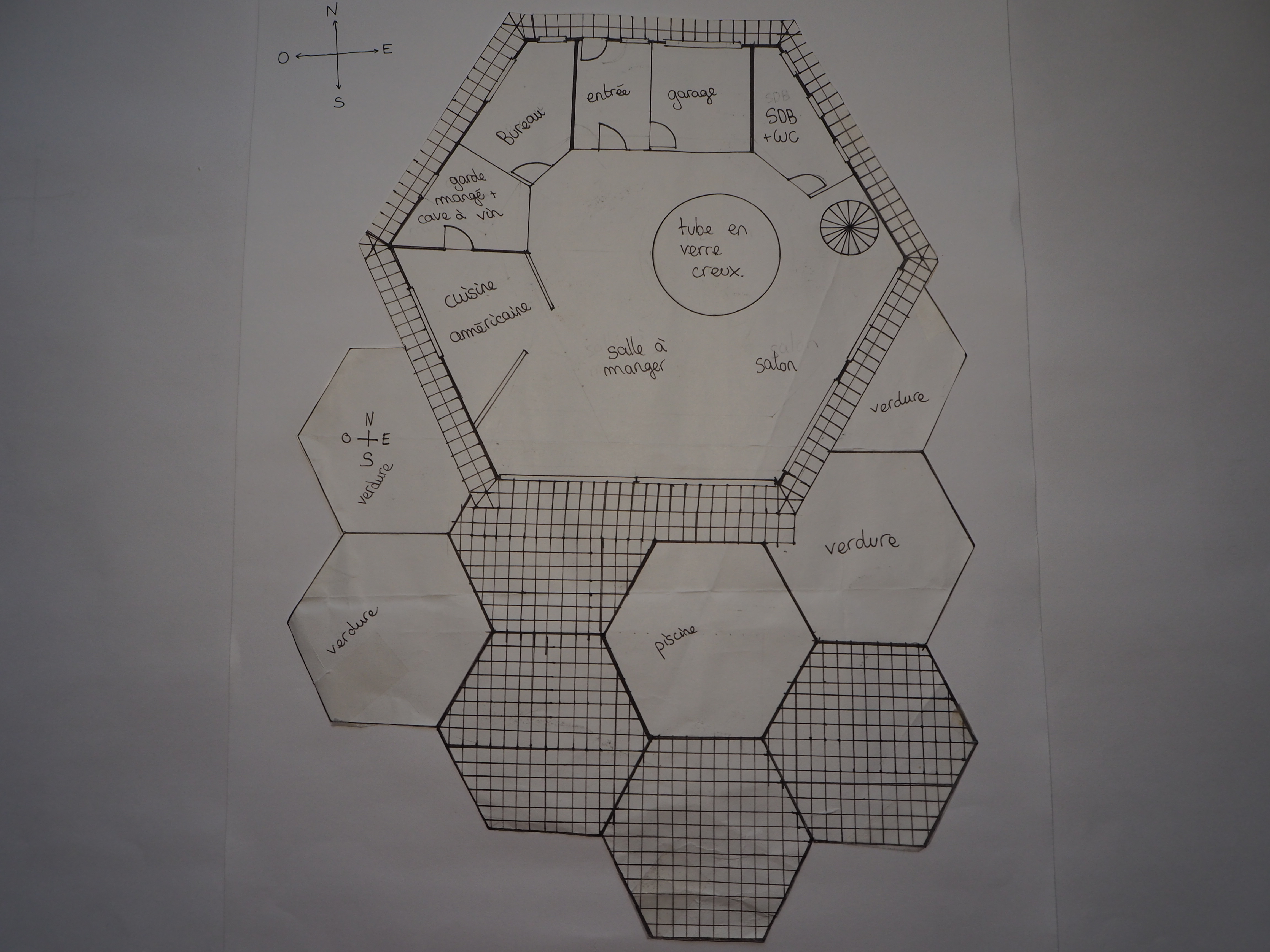 Pour ma part c'est une maison spatieuse, lumineuse et originale. Pourquoi cette forme hexagonale ? Et bien en réfléchissant à ma maison, je regardais ce que dessinaient mes camarades ; des maisons simples et rectangulaires. Trouvant cela trop banal, j'ai décidé d'imaginer une maison dont la forme est peu commune (d'où le choix de l'hexagone), et voici le résultat :